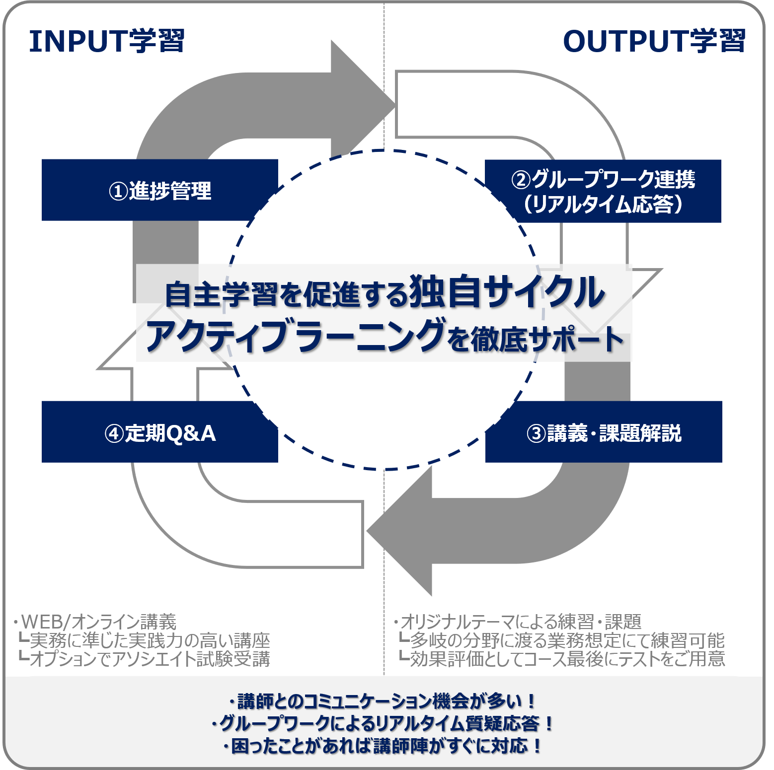 ・オンライン講義 ・動画復習 ・定期Q&A会 |