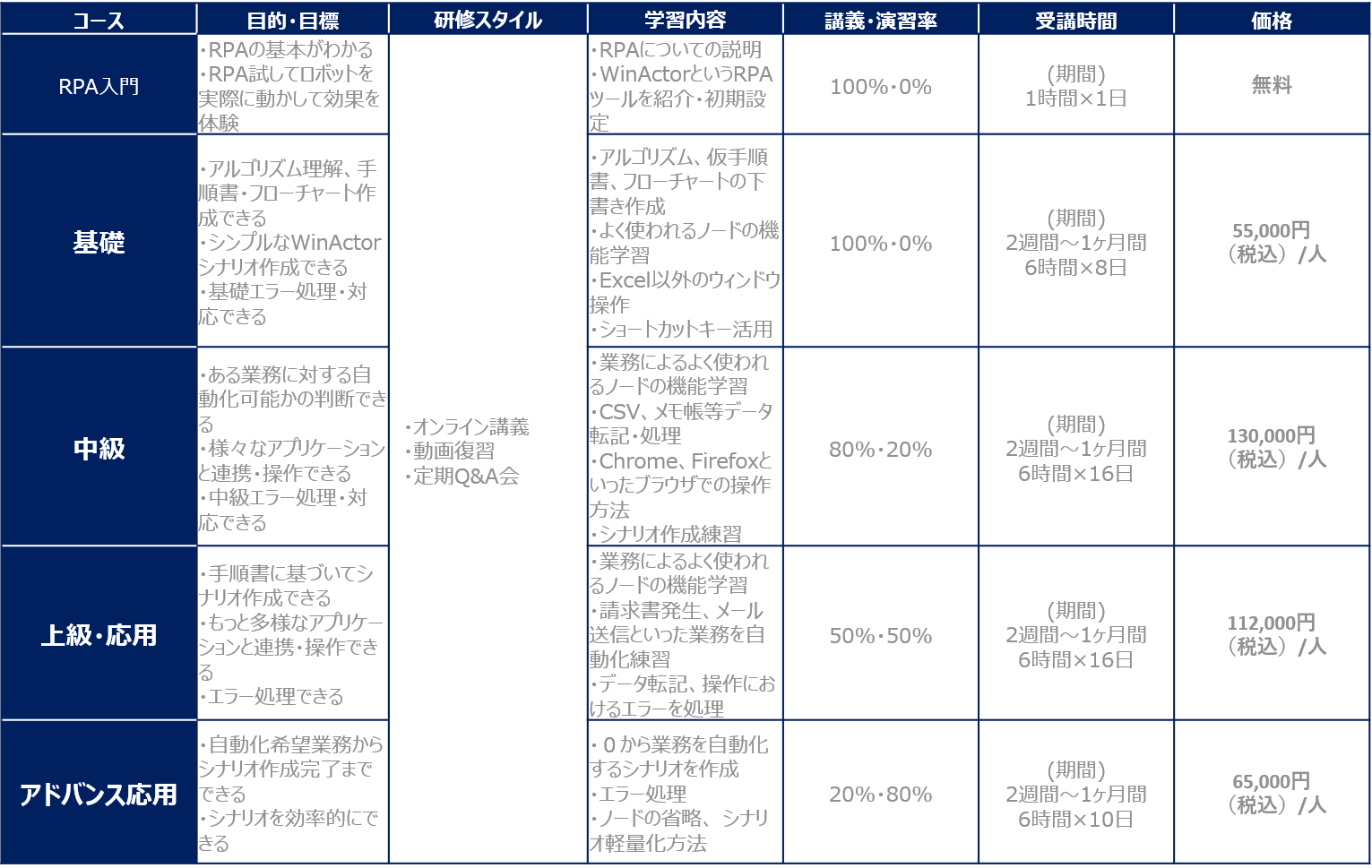 | 必要なスキル・知識 | WinActorの仕様把握、理解 (RPA入門で体験受講可能) |